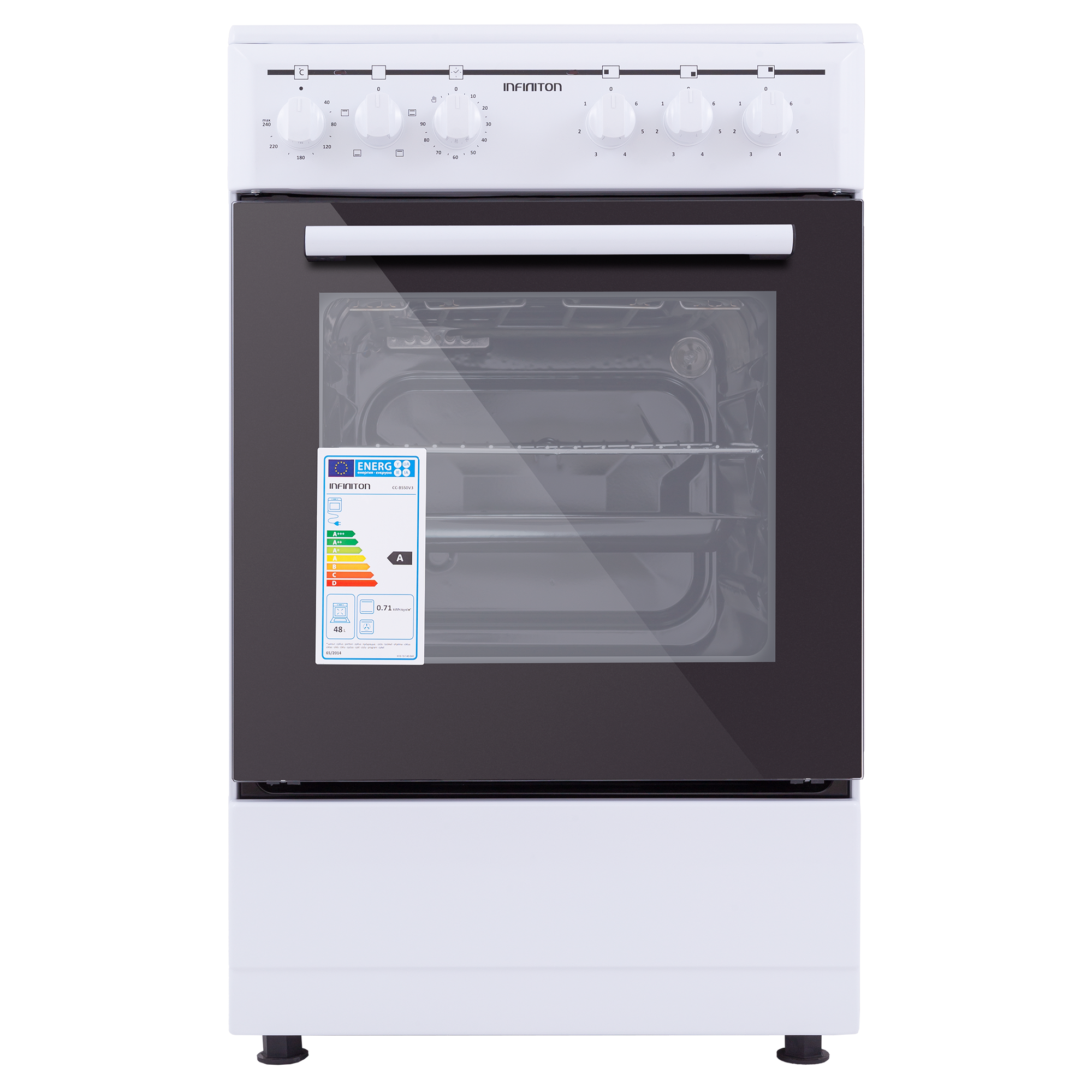 La cocina Infiniton CC-V350G dispone de una capacidad de horno de 43 litros y gracias a su clasificación energética A notará un ahorro en su consumo electrónico