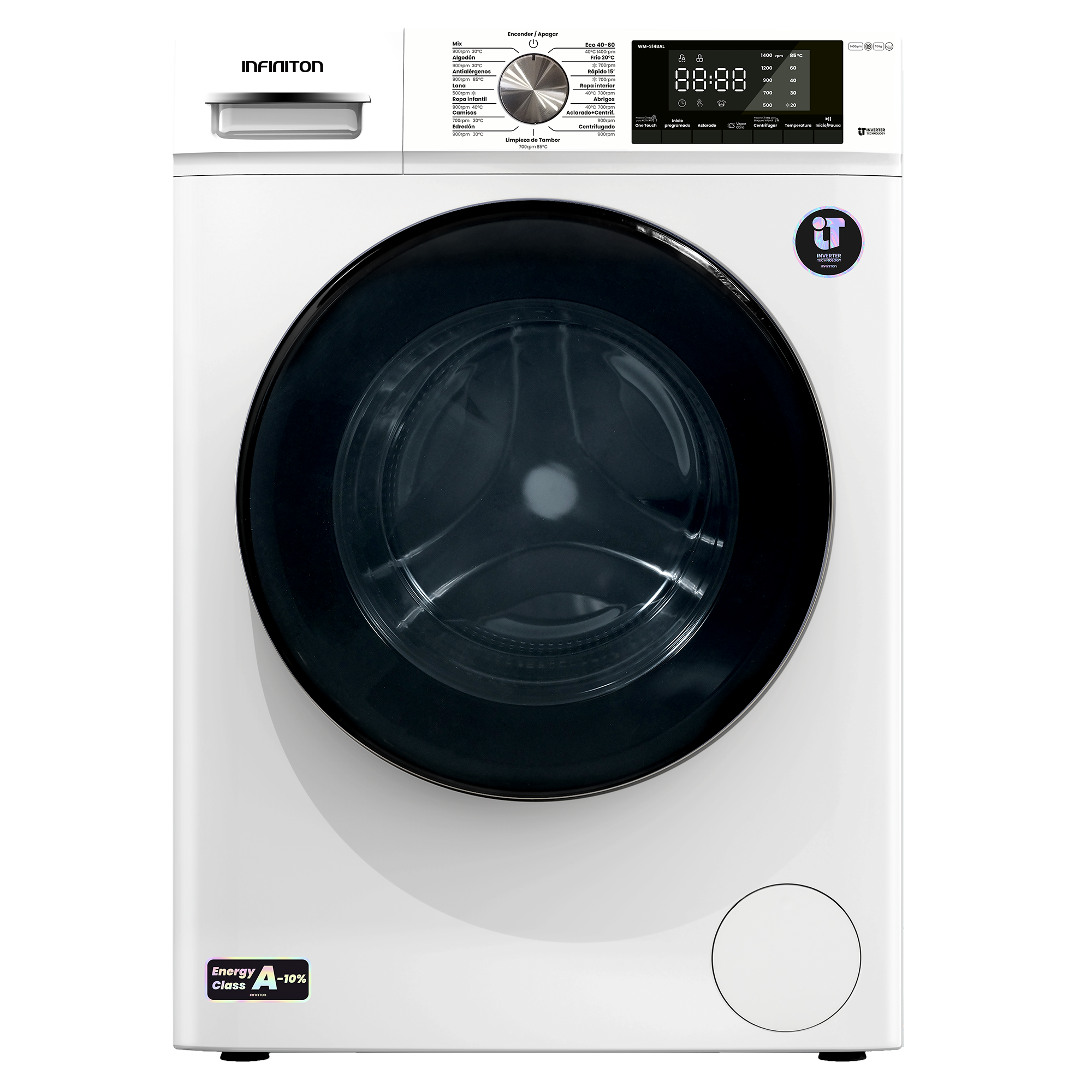 La lavadora Infiniton WM-S14BAL se caracteriza por tener una capacidad de 10 Kilos. Gracias a su clasificación energética A(-10%) percibirás un importante ahorro energético en tu factura de la luz.