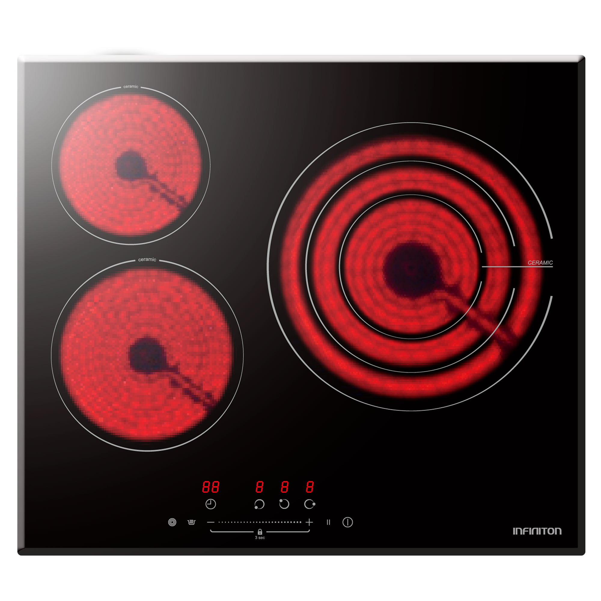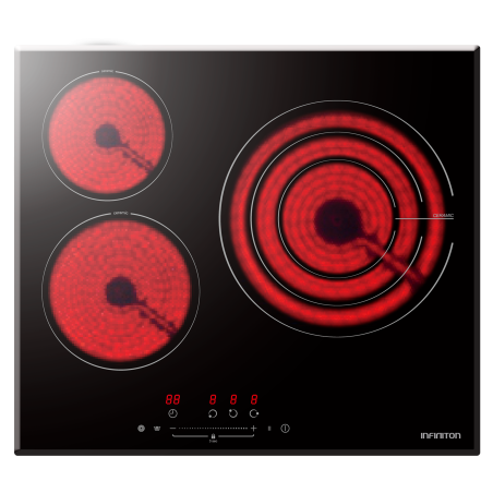 La placa vitrocerámica Infiniton VIT3SN30 dispone de 3 zonas de cocción y podrás elegir entre sus fuegos de diferente tamaño, con lo que conseguirás cocinar todas tus recetas favoritas.